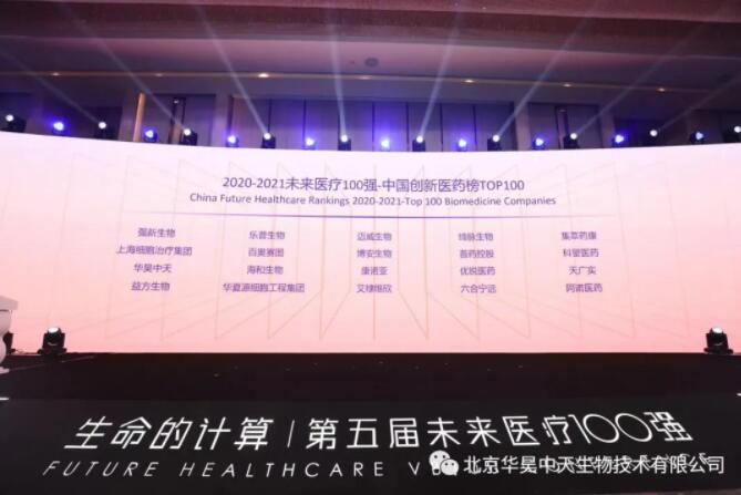 2021年4月16日,由動脈網(wǎng)主辦,蘇州市吳江區(qū)人民政府、廣東省鐘南山醫(yī)學基金會聯(lián)合主辦,蘇州市吳江東方國有資本投資經(jīng)營有限公司協(xié)辦的“第五屆未來醫(yī)療100強”大會在蘇州吳江盛大開幕。阿里健康為大會的獨家戰(zhàn)略合作伙伴。頒獎晚宴上,動脈網(wǎng)對外發(fā)布了《2020-2021未來醫(yī)療100強系列榜單》。華昊中天榮登未來醫(yī)療100強中國創(chuàng)新醫(yī)藥榜TOP100的第3名。